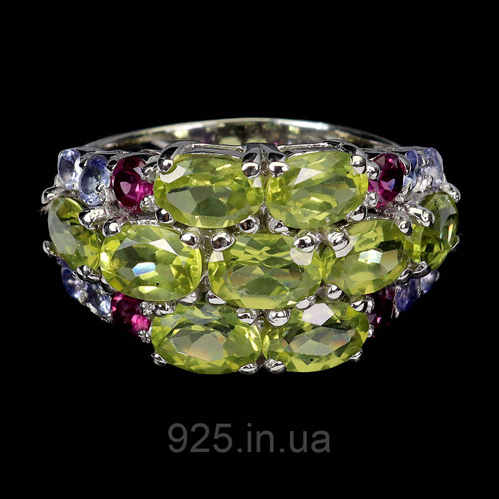 Каблучка. Натуральний перидот, гранат родоліт і танзаніт. Срібло 925.